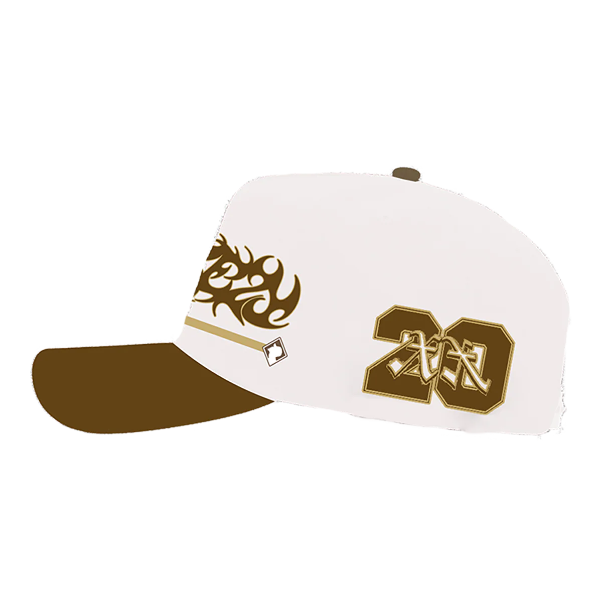 Brown hat features Breezy Bowl XX designs on front and sides. Heavyweight acrylic pro-style snapback hat, heavy structure, mid-profile, embroidery front/back/side.