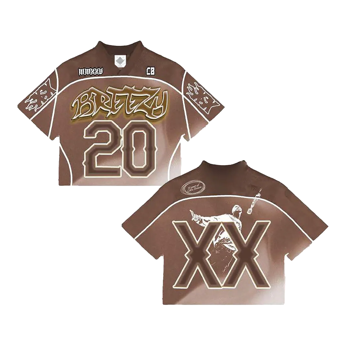 Brown football jersey features Breezy Bowl XX designs on front and back. 240gsm heavyweight polyester, sublimated with knit piping, woven neck label.